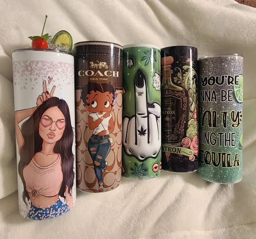 We offer clear, frosted and gradient-colored glasses with various designs to compliment any occasion. Using sublimation and UV/DTF transfers we can create one of kind cans. Each glass comes with a bamboo lid and straw. Decorated lids can be added for that finishing touch.